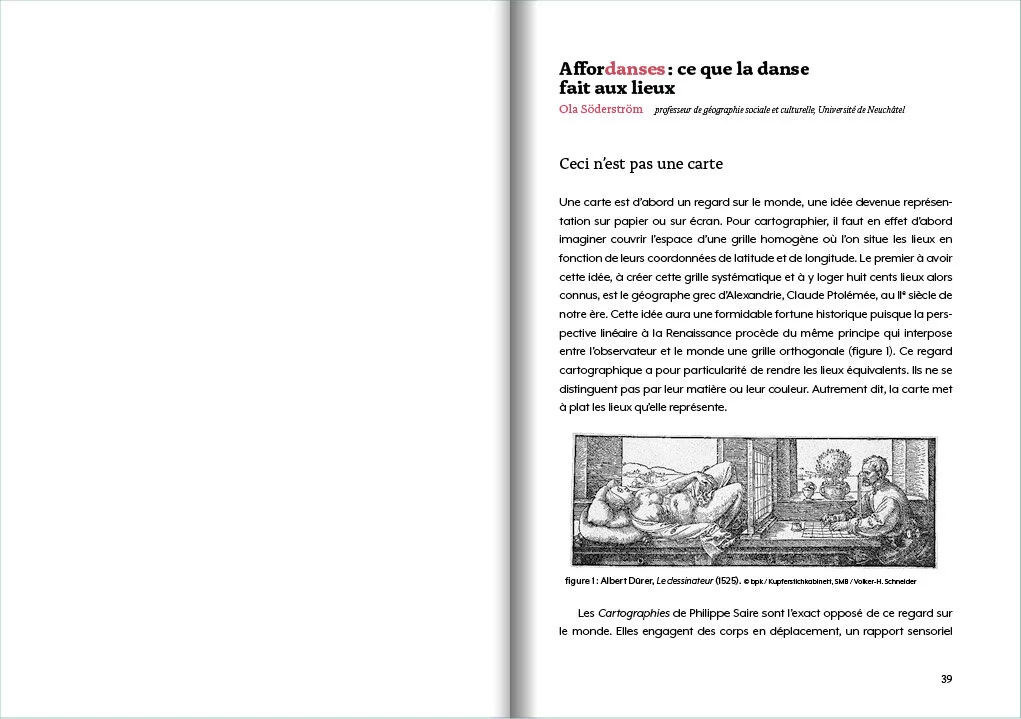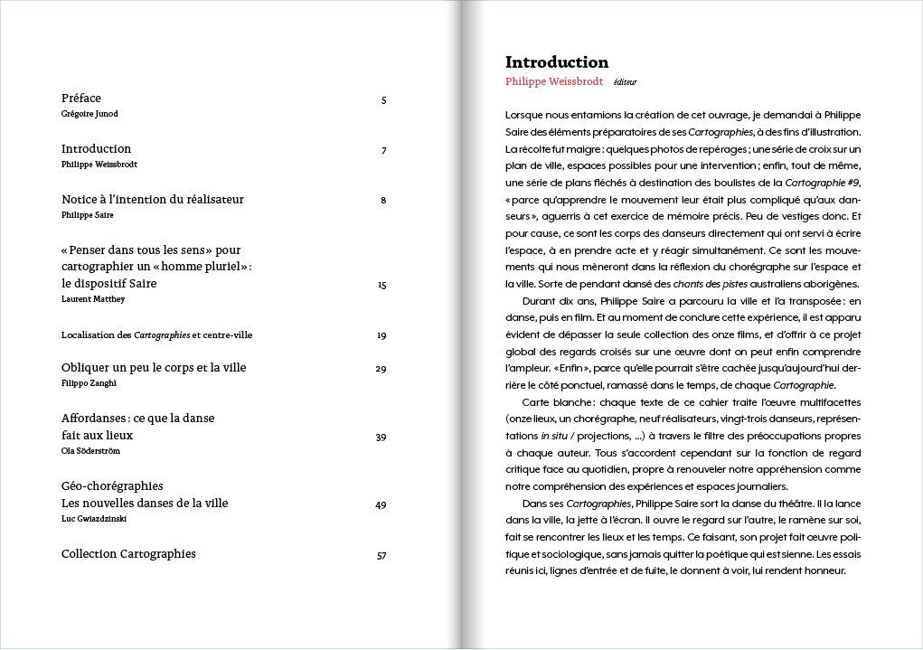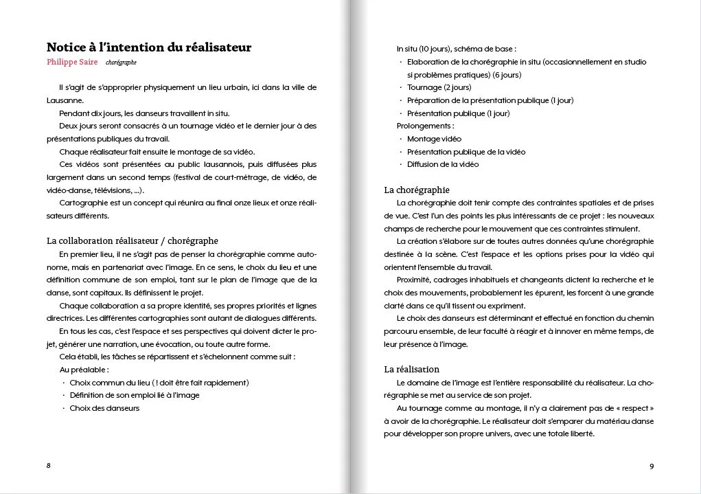 Lors de 11 « performances » Philippe Saire a fait découvrir au public plusieurs sites de la ville de Lausanne de manière insolite, par le mouvement. Cartographies témoigne de la volonté du chorégraphe de sortir la danse des théâtres. Il la rattache à la vie, l’amène aux gens qui passent.